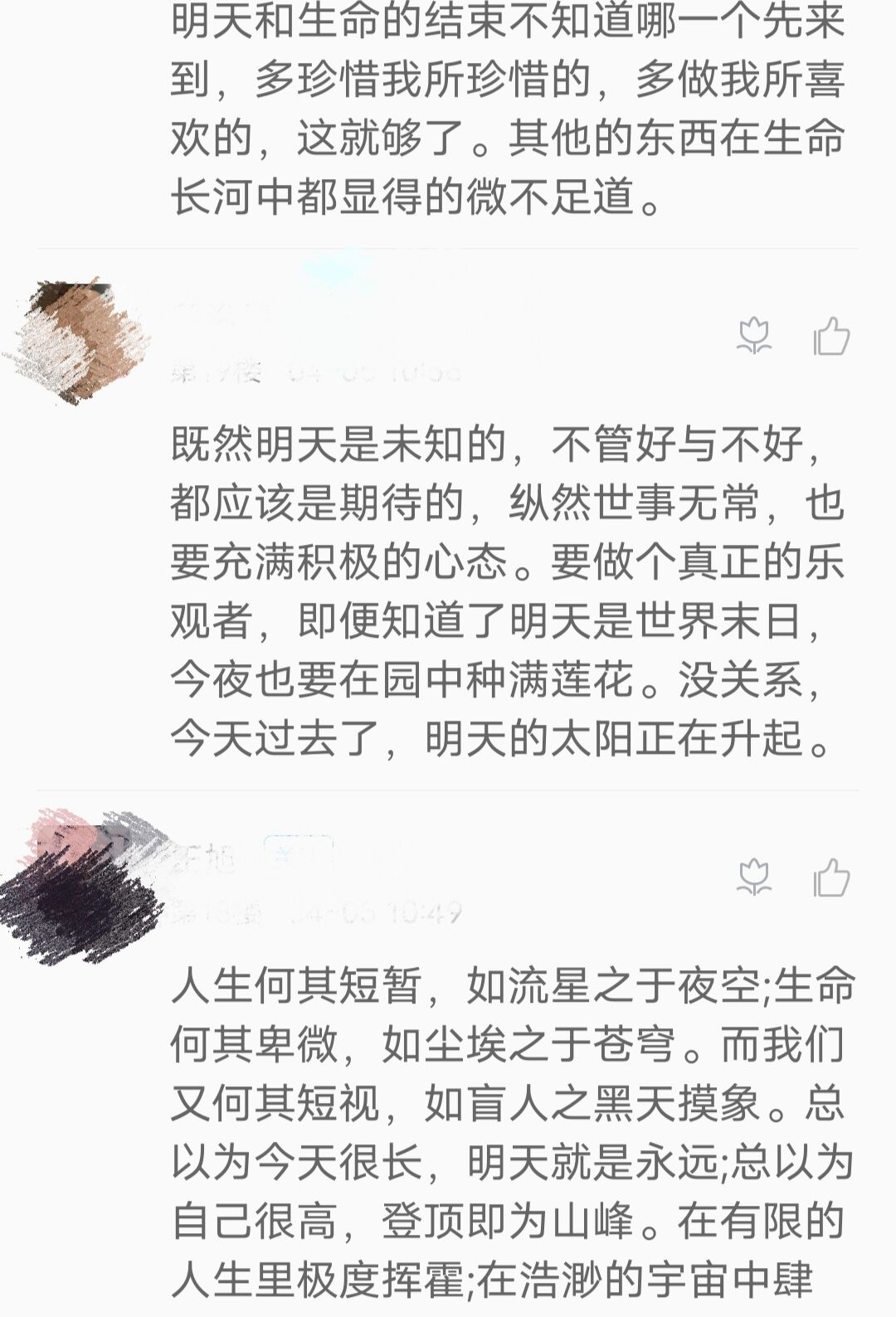 著名教育学家蒙特梭利说:“只有正确认识了死亡,才能更好地理解生命的意义”,第二环节我们引出直面死亡之感悟,提供发言平台,由同学们自由抒发学习见解。经历生与死的时刻,才更明白当下的可贵。又借由一首生命赞歌《Viva La Vida》,引出了“假如生命还剩最后一天,你会做些什么的思考”。最后,着眼当下,我部开展了关于“收集生命中的温暖”随手拍活动,花朵,晚霞,美食,阳光微风,或是身边人,总有一样能让你觉得生命温暖,未来可期。