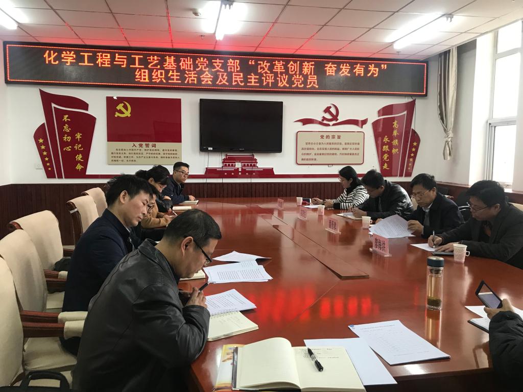 为深入学习贯彻党的十九大精神和习近平新时代中国特色社会主义思想,落实“改革创新 奋发有为”大讨论工作,进一步提高党支部战斗力,发挥作用。根据省委教育工委《关于召开2018年度基层党组织组织生活会和开展民主评议党员的通知》(晋教工委组〔2019〕7号)文件精神,2019年4月4日下午,化学工程与技术学院化学工程与工艺基础党支部召开专题组织生活会,副校长潘晋孝、组织部副部长常旭青莅临指导本次会议,院党委书记廖海洪、院长祁贵生列席会议。