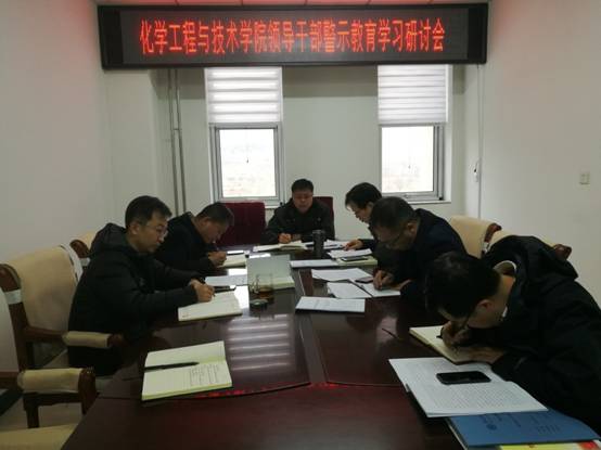 为贯彻落实学校纪委关于《党的十九大以来查处违纪违法党员干部案件警示录》和《叩问初心》警示教育材料的学用工作,11月28日,化学工程与技术学院召开党员领导干部警示教育学习研讨会,全体院领导参加会议。会议由院党委书记廖海洪主持。