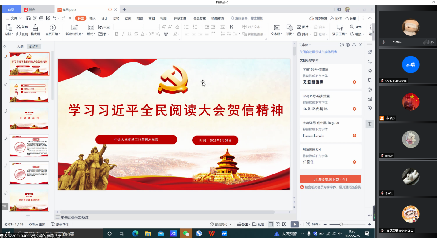 2022年5月25日上午化学工程与技术学院党委组织全体党员通过腾讯会议(会议号:158669328学习贯彻习近平总书记致首届全民阅读大会贺信精神。