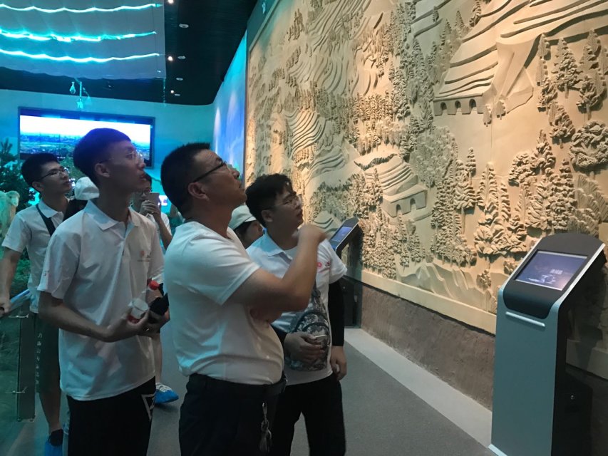 在解说员的带领下,实践队员们走进了正管,映入眼帘的是是两幅浮雕,高五米,宽二十米,分别讲述着陕西省北治沙、南治土的艰辛历程,看着浮雕一处处精美的细节,从左向右由沙漠到绿洲,榆林人民首创飞机播种,引领世界治沙走向前沿。在主题厅内队员们看到了墙壁上引人注目的榆林治沙精神:不畏艰难,勇于拼搏,矢志不渝,开拓创新。解说员说:当年的老榆林由于沙漠向南蔓延导致三次南迁,在上世纪还能排到老榆林城墙被风沙掩埋不足一米高。历经六十载风沙漫天,榆林人将毛乌素沙漠几乎消灭,堪称世界奇迹。