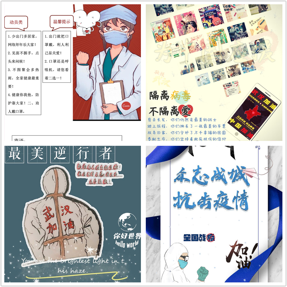 白衣天使逆行时无畏坚定的背影,各方的温暖援助和爱心物资,疫情防控的温馨提示,通过线上平台举办“防疫海报制作大赛”传达了抗击疫情的坚定决心,对抗疫一线的美好祝福都通过海报淋漓展现。