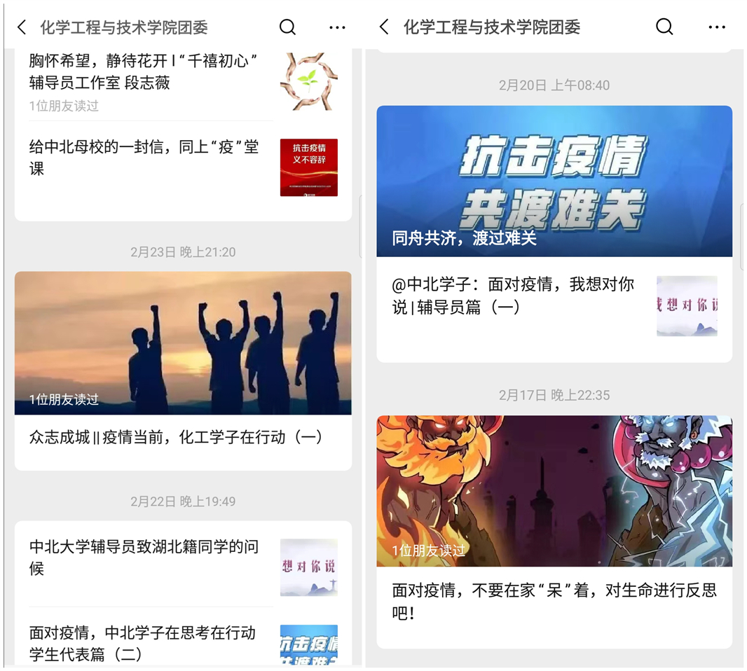 化学工程与技术学院团委公众号上也为大家推送了许多精美的文章。有倡议对生命进行反思的谏言;疫情期间的趣事;中国与瘟疫的千年斗争历史;众位同学给予学校的寄语;假期生活的成果分享;辅导员们对学生的谆谆教诲;志愿者同学们在抗“疫”战线上的点点滴滴……
