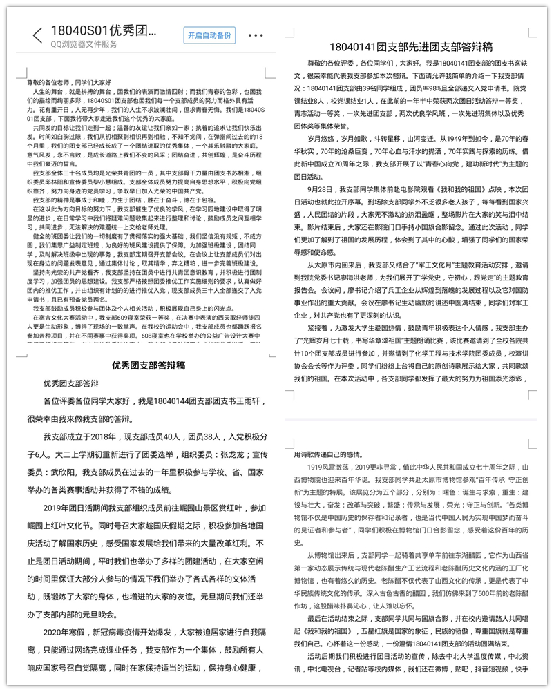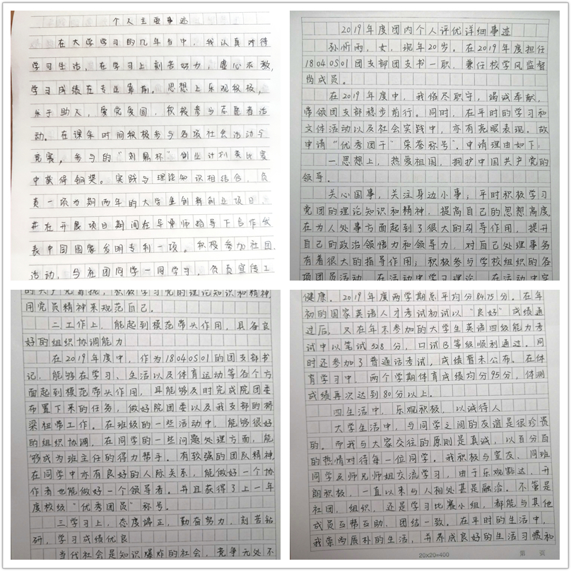 参评优秀团干及标兵、优秀团员及标兵的同学通过录制答辩视频的方式学习成绩、工作经历、个人收获等方面进行汇报;参与评选五四红旗团支部、先进团支部的团支部也上交了报告,阐述了组织建设、制度建设、文体活动、社会实践与科技创新等方面,总结了团员教育、团日活动、学风建设等支部建设工作中所取得的优异成绩;参选优秀团日活动的集体递交了报告,从活动的创新性、趣味性、教育性、知识性等方面进行介绍,分享活动的策划、动员、实施、宣传等方面的经验。
