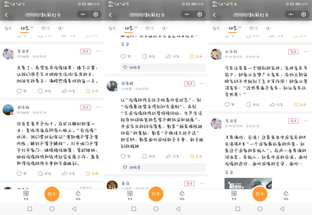 此次团日活动共24个团支部、超过1000名团员参与,各支部充分利用各种网络资源,方式新颖独创,内容别具一格。18040S01团支部组织成员观看《中国抗疫志》并分享观后感,使支部成员深刻感受到中国共产党的坚强领导,坚定了支部成员责任担当意识;18040141团支部结合当下热点,共唱《同根》,致敬英雄,感恩祖国,为此次疫情贡献自己的力量;19040403团支部在团支书的带领下共同学习习近平总书记的av影片相关的文章,共同探讨疫情下大国制度的优势;19040405团支部积极号召支部成员们以短视频的方式表达自己对于疫情期间社会主义制度发挥的优越性的看法。