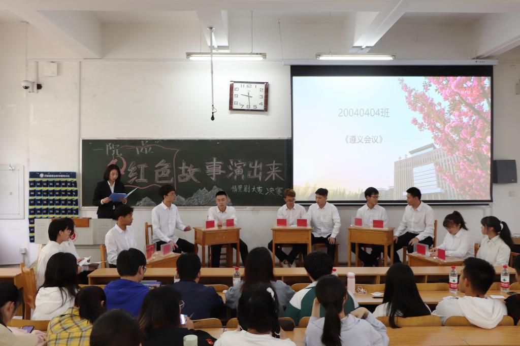 在观众热烈的掌声中,比赛开始。参赛班级围绕着红色故事这一主题展开,所表演的的内容各具特色。20040404班所表演的遵义会议体现了遵义会议作为中国共产党生死攸关的转折点的重要性;19040S0119040143班以五四运动为主题排演的节目恰同学少年,再现当年学生群体誓死保卫国家主权反抗帝国主义压迫的情景;19040241班则向大家展现了标志中国共产党成立的会议——中共一大,向我们呈现出革命年代,特务的步步紧逼和革命先辈们的英勇无畏演员们生动形象地演绎红色故事,将红色精神传给了在场的每一位观众。最后,大赛在杨航同学的歌声中落下帷幕。通过各评委的评分,19040141班获得一等奖20040341班获得二等奖19040241班获得三等奖。