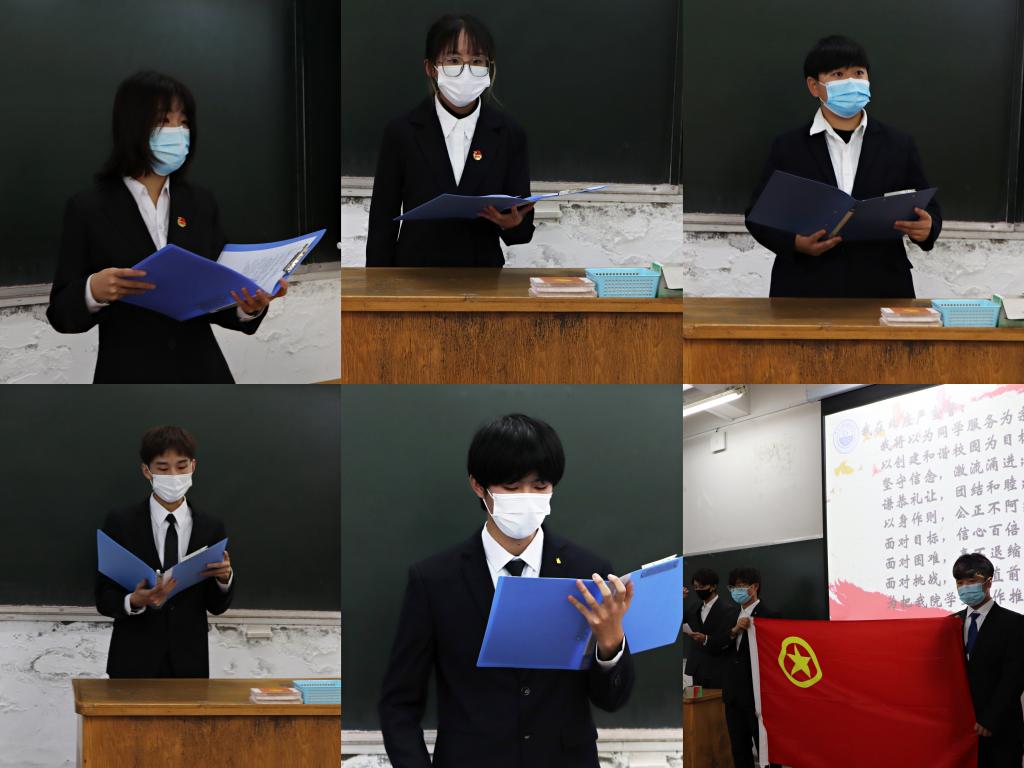 会上,院团委副书记及学生会主席团成员,进行了2021-2022年各学生组织工作计划的汇报。团委副书记钟秋怡同学条理清晰地向大家说明团委的总体工作规划,表示会在今后的一年里不断完善制度体系建设,全面贯彻党的教育方针,营造良好的学习氛围。团委副书记邱治慧同学的发言围绕职位心得和工作心得两方面展开,她强调学生组织应明确自己的职责,帮助老师做好学院团学工作,在继承中求创新,争创“五四”红旗团委。学生会执行主席欧白杨同学在工作计划中指出,新的一年里应深入落实学生会改革要求,推动作风转变,做好主题思想教育。分科协主席孟志鹏同学则表示,为激发学生们创新意识,提升实践能力,分科协会开展多项工作计划,让同学们在良性竞争中不断成长。学生服务中心主任姜帅同学提出学生服务中心的宗旨——同学服务,力求以坚持和落实为主,帮助同学们解决学习和生活中的各种问题汇报结束,全体学生骨干在蒋亚宏同学的带领下宣读誓词。
