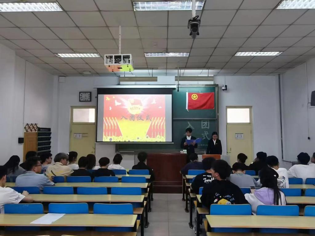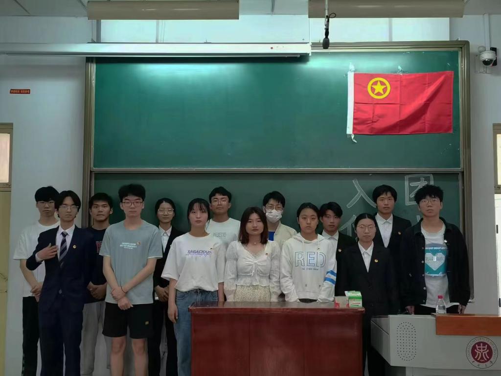 庄严的红色团旗,激昂的共青团团歌,为这次新团员入团仪式平添一份肃静。李展志同学在介绍了学生团员的发展简史之后,宣读了新团员的名单,他们是来自21级的吉潇杰同学、郭含宇同学、李霞同学和陈忠婷同学和来自22级的程浩东同学、陈昊同学、孙孜淳同学。