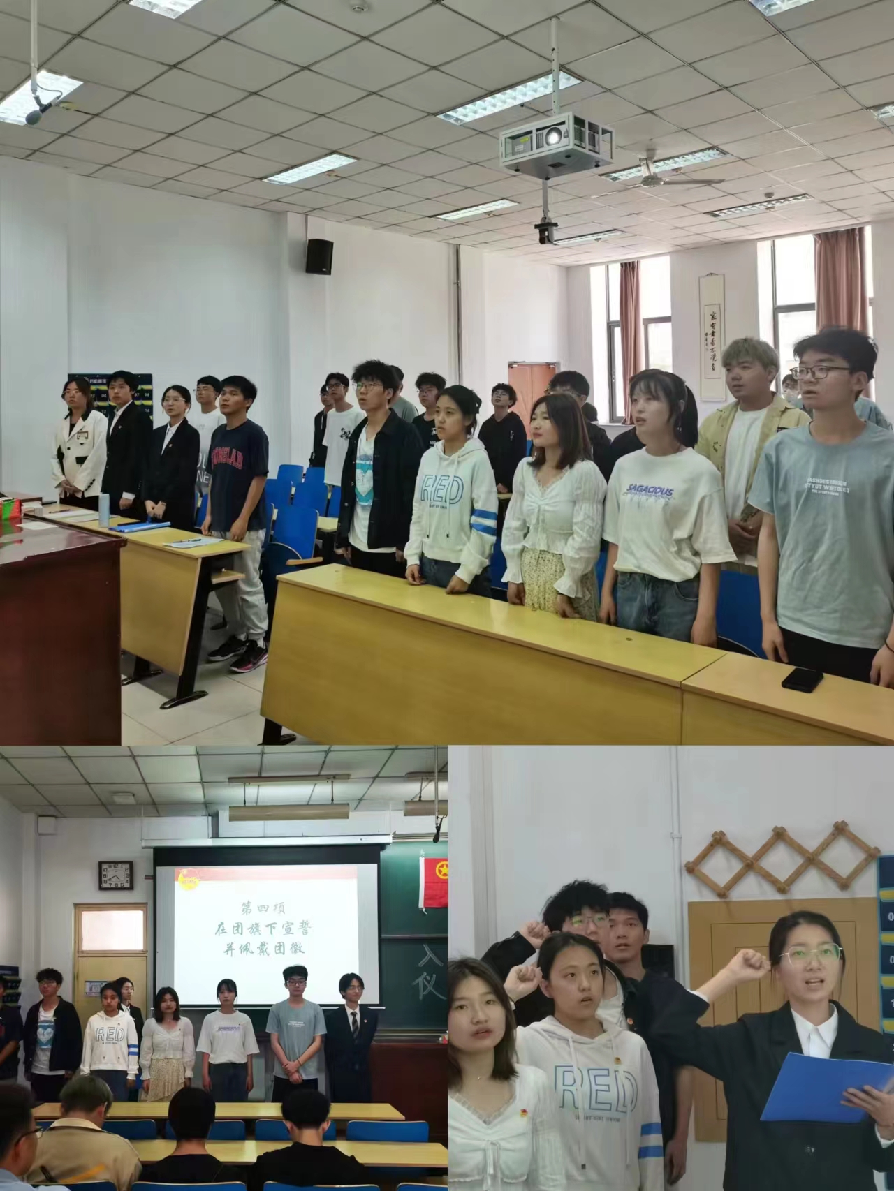 在鲜红的共青团团旗的下,新团员的胸前也都挂上了共青团的徽章。他们在领誓人林煜堞同学的带领下,紧握右拳,向团组织表明自己的决心。新团员许下的不仅是青春的誓言,更是对前行者的致敬,是对红色基因的传承,是对共青团一场激情的告白。在宣誓仪式结束后,主持人介绍了入团流程。作为团员代表的王帅同学向新团员表示祝福并鼓励他们勤奋学习、不断进取,以实际行动展现共青团员的先进性,继承和发扬爱国主义精神。新加入的团员代表程浩东同学向团组织表明决心,以及阐述自己对团的认识。