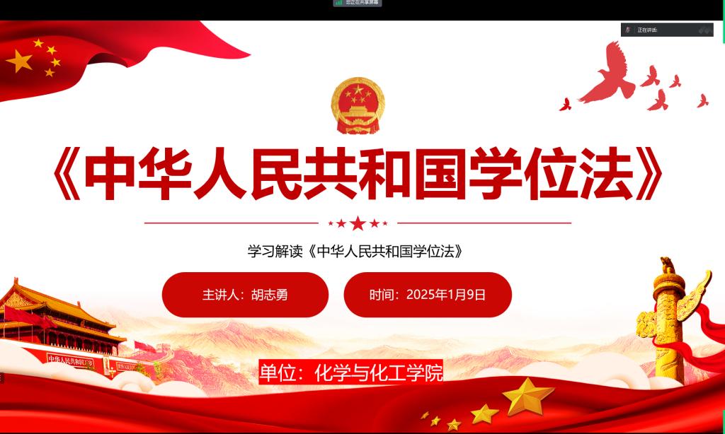 2025年1月9日,学院组织全院师生通过腾讯会议进行了集中学习,由胡志勇副院长领学,根据新学位法的要点内容,围绕学位工作体制、学位授予的资格、条件、程序以及学位质量保障等方面进行了深入的学习。同时,会后就学生们咨询的研究生学位论文盲审、技术保护、学硕毕业发表小论文要求等问题进行了解答。