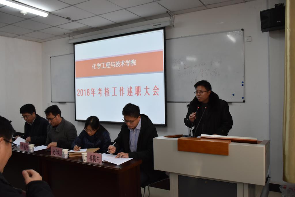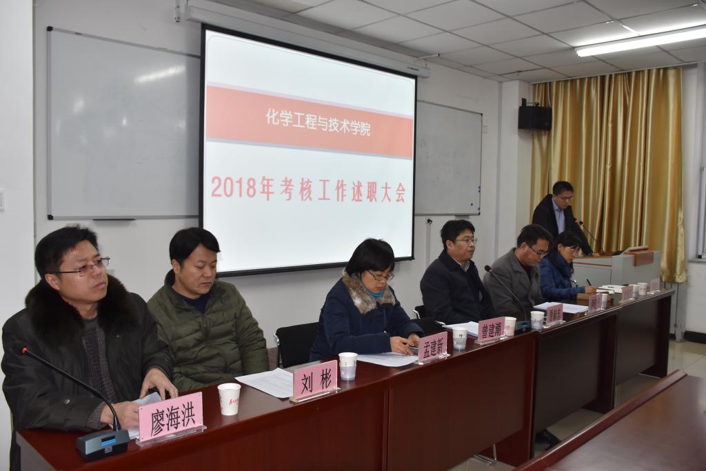 1月21日,化学工程与技术学院在科学楼206召开领导班子及领导干部个人述职述廉会议。由校党委组织部部长贾献忠、审计处处长孟建新、学生处处长尹建平、离退休人员管理处处长刘彬、纪委监察处副处长史育红等人组成的考核组参会,学院领导班子及全体教职工参加会议。会议由贾献忠部长主持。