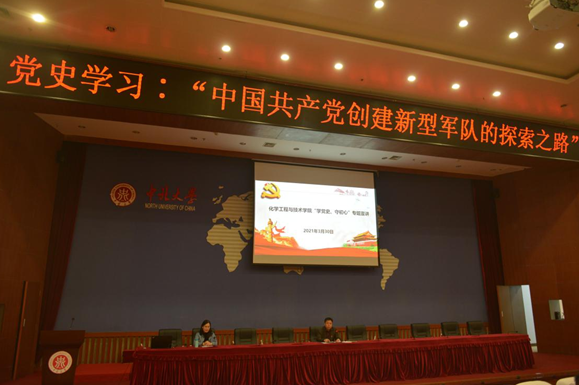赓续百年初心,凝聚奋进力量。3月30日下午,化学工程与技术学院党委特邀校党史学习教育理论宣讲团成员马克思主义学院韩秀兰同志做题为“中国共产党创建新型军队的探索之路”专题报告,学院全体院领导,全院师生党员参加了专题学习。报告会由院党委书记廖海洪主持。