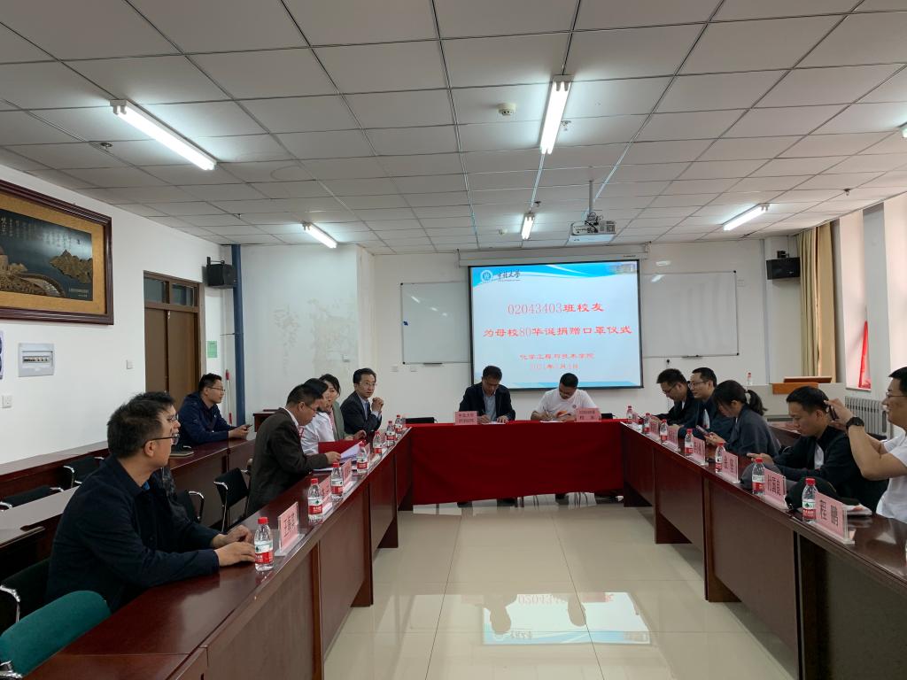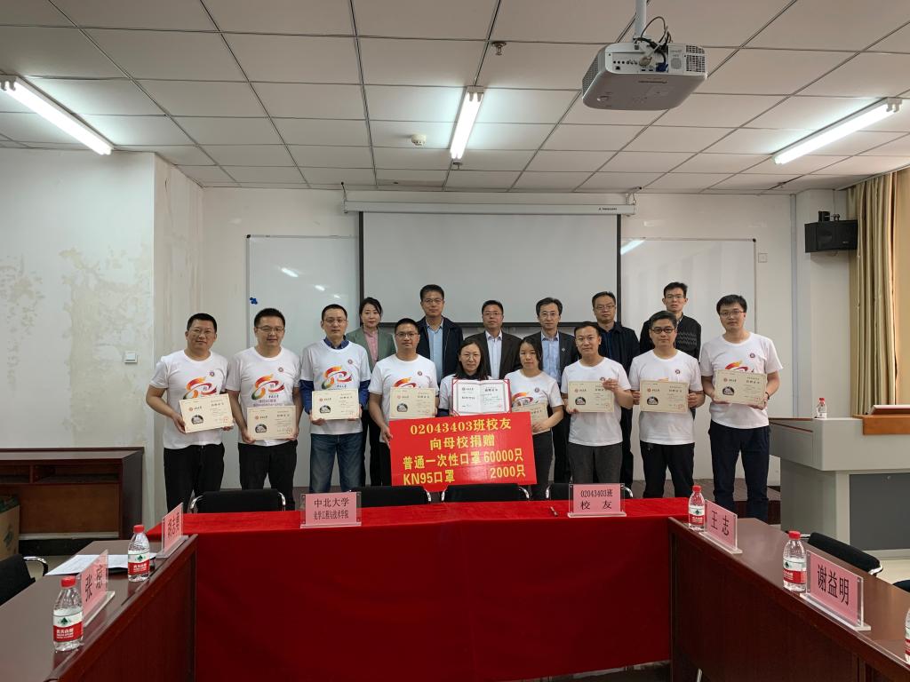 5月4日上午,化学工程与技术学院02043403班校友为母校80华诞捐赠防疫物资仪式在科学楼206举行。02043403班校友代表李小刚一行8人、院党委书记廖海洪、院长祁贵生、院党委副书记李云、副院长王海宾、副院长胡志勇参会。校友办综合办主任张琼、02043403班主任王金霞应邀参加。捐赠仪式由院党委书记主持,院长祁贵生代表学院接受捐赠。此次02043403班校友共为母校捐赠一次性口罩60000只,KN95口罩2000只。