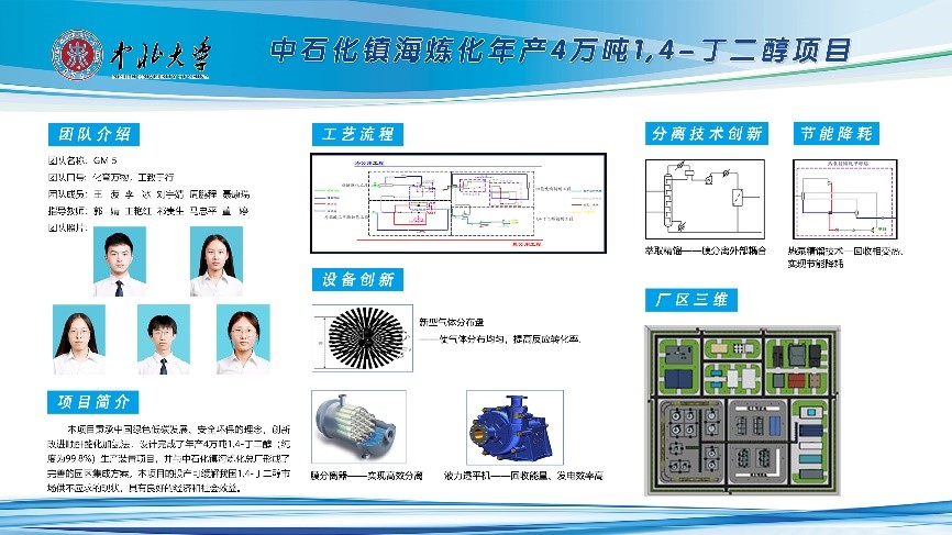 在教务处与学院领导的大力支持下,大学生化工设计竞赛指导团队投入了大量时间和精力辅导学生参加西北赛区预选赛以及国赛。在指导过程中,大学生化工设计竞赛指导团队教师们以学生为中心,采用“班级引导-团队指导-个体辅导-过程督导”的实践教学模式,让学生自主参与到设计软件应用、仿真操作、市场需求调研、项目可行性分析、化工设计等实践环节,充分发挥学生的主动性,用中学、学中用。此外,为了加强学生的工程实践能力,暑假期间指导教师们带领学生去赛鼎工程有限公司进行了实地参观交流学习。通过与企业工程师及行业专家的近距离交流,学生对于化工领域知识和基本理论的理解更加深刻,促进学生掌握实施化工项目设计所需的基本方法和技能,并提高了利用创新方法解决工程设计实践中复杂问题的能力,为高质量化工设计竞赛参赛作品的顺利完成起到了促进作用。经过近半年的时间,学院师生们刻苦训练、反复研讨,在工艺路线、分离技术和过程节能和设备设计、资源利用、环保、安全、经济等进行多方面创新设计,使用多种现代设计方法设计了一座充分反映新时代化工设计理念的1,4-丁二醇生产装置项目。该竞赛有助于培养学生创新思维、工程技能和团队协作精神,且在增强大学生的工程设计与实践能力,实践“卓越工程师教育培养计划”等方面起到了重要作用。