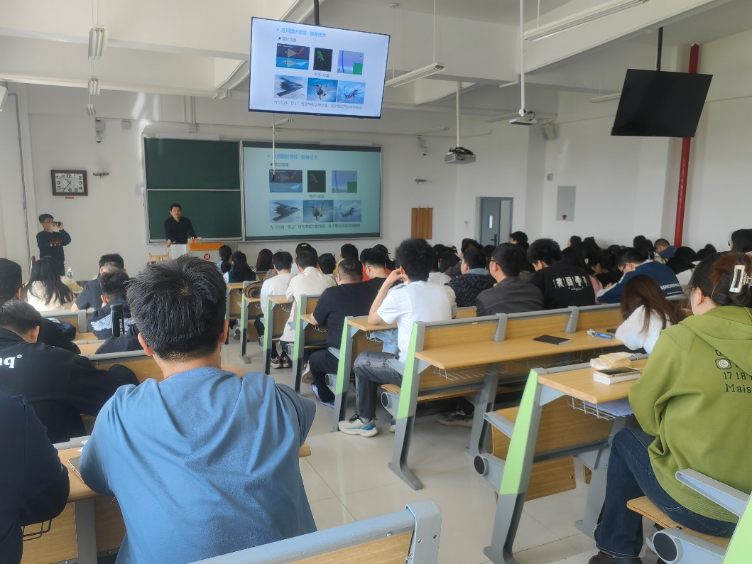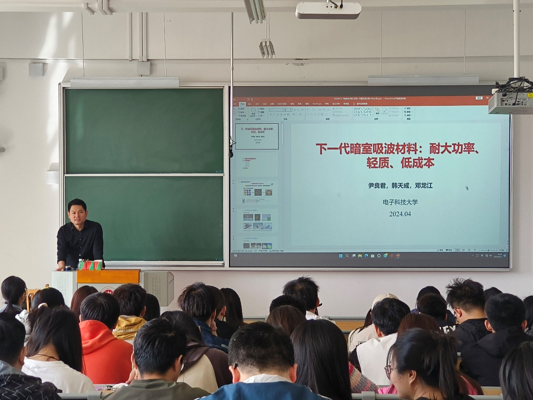 尹老师形象生动地向同学们讲解了电磁功能材料的特性以及应用场景立足国家重大需求,针对当前波暗室建设造价高、耐高温吸波材料稀缺等痛点,尹老师及团队通过长时间钻研探索,研发出一种室温制备的低成本、耐高温暗室吸波材料,并对材料结构进行轻量化,提升应用性能。此外,尹老师与同学们分享了自己的研究心得,勉励同学们要耐的住寂寞,树立信心,坚持不懈,勇于创新和探索,一定能够在科学探究的路上取得成功。
