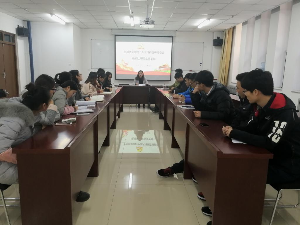 由硕士研究生党支部书记贾苗苗老师组织,以集体研讨的形式展开党的十九大精神学习。会上贾苗苗老师首先就党的十九大基本概况以及十九大精神进行了传达和分享,并组织展开支部内部交流研讨,分享党员个人对十九大精神的学习和领会。张丹丹、王京宝等党员就党的十九大精神学习理解情况进行了分享,提出认真贯彻落实十九大精神,以一个合格的研究生党员标准严格要求自己,为实现两个“百年”的目标贡献自己的力量。会议最后由贾苗苗老师进行总结,对支部党员提出要求,在学习党的十九大精神的基础上,从自身做起,从生活、学习、科研做起,做未来合格的接班人。