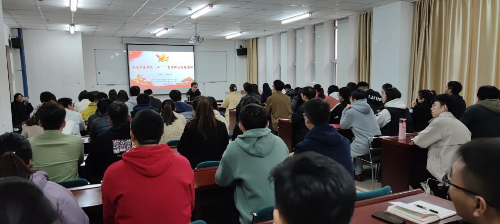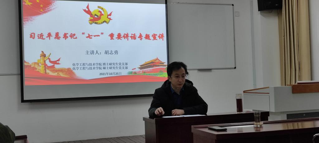 2021年7月1日,天安门广场召开庆祝中国共产党成立100周年大会,习近平总书记发表了重要讲话。讲话深情回顾了一百年来中国共产党波澜壮阔的奋斗史。一百年来,我们党从无到有、由小变大,实现了伟大飞跃,在实现“两个一百年”伟大目标征程上奋勇前进。化学工程与技术学院硕士研究生党支部邀请科研院长胡志勇老师于2021年10月25日在科学楼206开展了“习近平总书记‘七一’重要讲话”专题宣讲,党支部书记贾苗苗老师主持会议,硕士研究生党支部、博士研究生党支部全体党员参会。