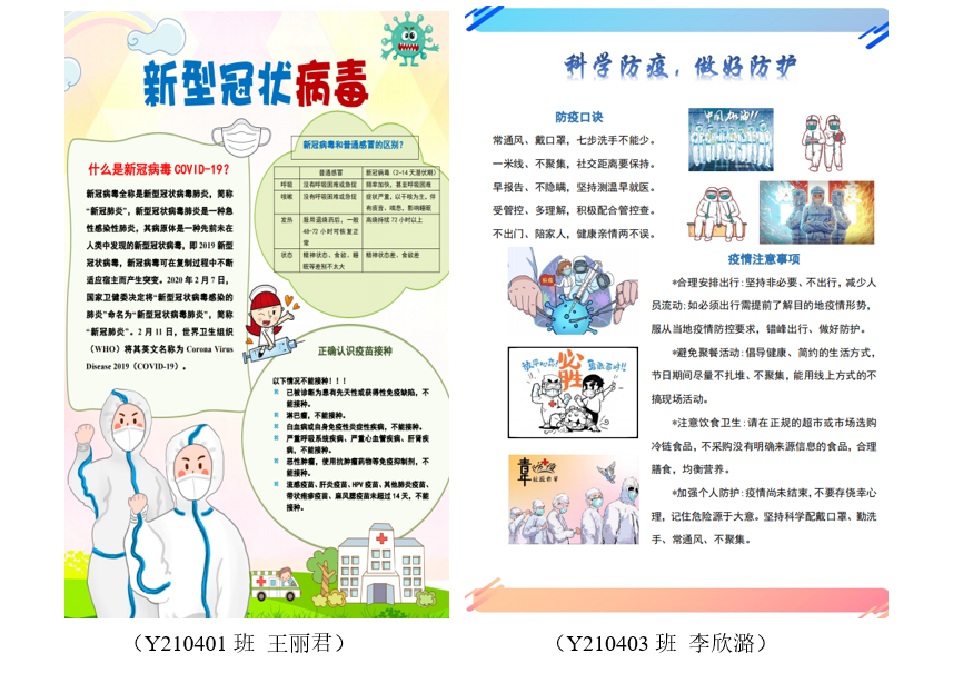 马瑶、王琪润、王丽君、李欣潞等同学制作了防疫宣传海报,为大家传播了防疫知识,进一步加强了大家对疫情病毒的了解和疫情防控的措施。徐铭悦、刘伟东、李甲男、孙同等同学通过一些在防疫期间校园美景图片和文字来鼓励大家,与学校共同坚守抗疫,一起迎接彩虹。傅乃炜、李晓、武瑞晗等同学通过写诗再附上美景图片这些独特的形式来与大家分享,进一步的增强了大家的抗疫信心。