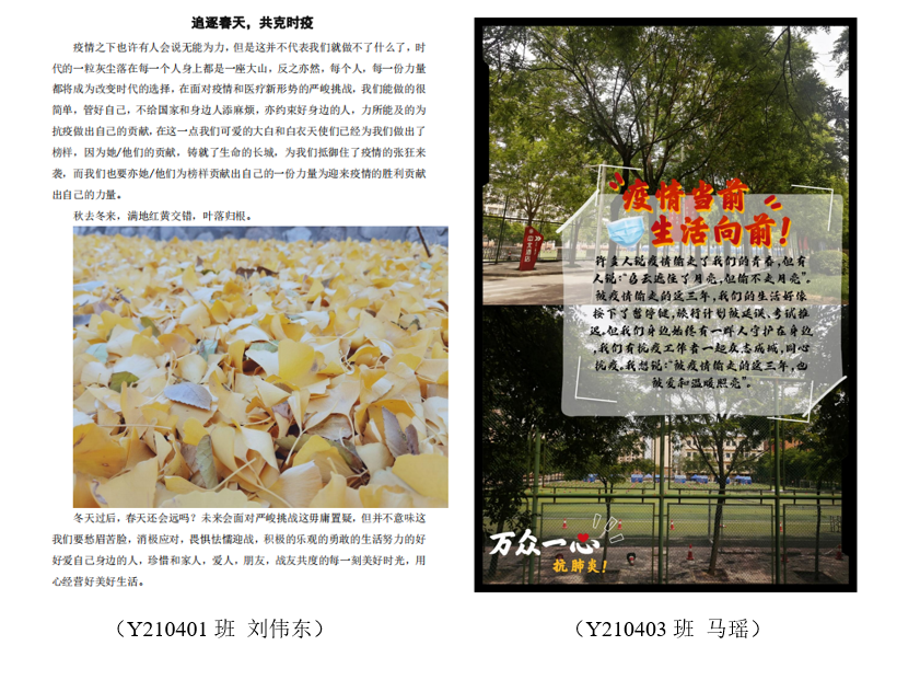 本次活动以抗为主题,设立了图文征集和宣传手册绘制两项活动,让同学们分享疫情期间的校园生活以及身边的趣事,帮助同学们了解更多的科学防疫知识。在同学们的积极配合下,本次活动圆满完成。最终通过评比选出了12个优秀作品,以下为作品展示:
