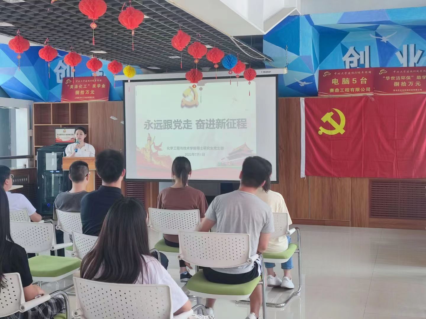 今天是中国共产党成立101周年纪念日,今年也是党的二十大召开之年,伟大的中国共产党,已经走过了一百多个年头。为全面回顾中国共产党建党101年以来走过的光辉历程,激励高校基层党组织和广大党员充分发挥战斗堡垒和先锋模范作用,化学工程与技术学院硕士研究生党支部于2022年7月1日在科学楼C座七层连廊,开展庆祝中国共产党成立101周年“永远跟党走,奋进新征程”活动。学院党委书记廖海洪,党支部书记贾苗苗,硕士研究生党支部全体党员、入党积极分子、部分共青团员及群众参会。