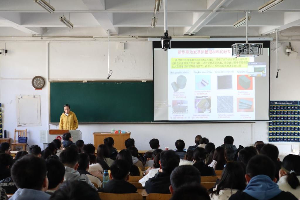 宋燕教授围绕系列高性能聚丙烯腈基碳纤维的研制与应用、新型高效炭基热管理材料的研制与应用、高倍率钾电负极用沥青基软炭的制备、石墨烯规模化制备及应用、先进炭材料研发与应用以及锂离子电池的重要组成和工作原理等方面展开详细的叙述。宋燕教授提到化工与其他学科的紧密联系,讲解了许多相关实例,并鼓励同学们在未来的学习与科研中大胆创新,努力为学科、专业的建设发展贡献自己的青春力量。宋燕老师还从山西煤化所的历史沿革以及代表性成果讲起,通过讲述近年的研究方向和成果,提出科研要面向国家重大战略需求,目标清、可考核、用得上、有影响。