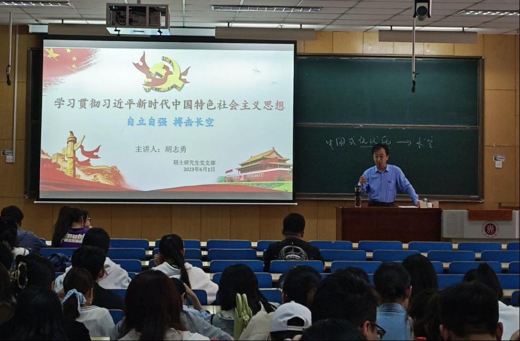 硕士研究生党支部于2023年6月1日下午3点在11109H召开“学习贯彻习近平新时代中国特色社会主义思想——自立自强 搏击长空”主题教育党课。会议由党支部书记贾苗苗主持,院党委委员胡志勇老师主讲,全院所有研究生党员及入党积极分子参会。