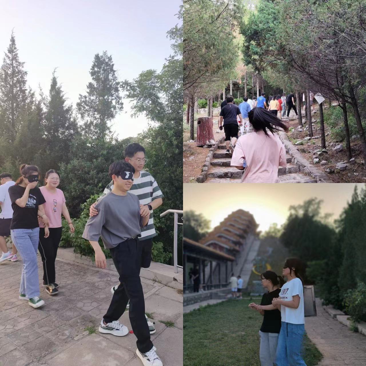 到达山顶后,贾老师组织的击鼓传花瞬间活跃氛围,让彼此熟悉;随后开始了“信任之旅”活动。信任之旅是随机两人一组,一个是“盲人”(戴着眼罩),一个好心人是“哑巴”(全程不能说话);活动要求是让好心人“哑巴”带领“盲人”,走过一段坎坷的道路,并保护“盲人”不受伤害,整个过程中不能用语言交流;一次旅程结束后,再互换身份进行。信任之旅结束后,每位同学都分享了自己的感受。这个项目不仅考验了同学们的勇气、信任和团结协作精神,也锻炼了他们的身体素质和心理承受能力,促进同学们之间更好地配合与沟通,既增加了活动的趣味性,也培养了同学们的团结意识和问题解决能力。