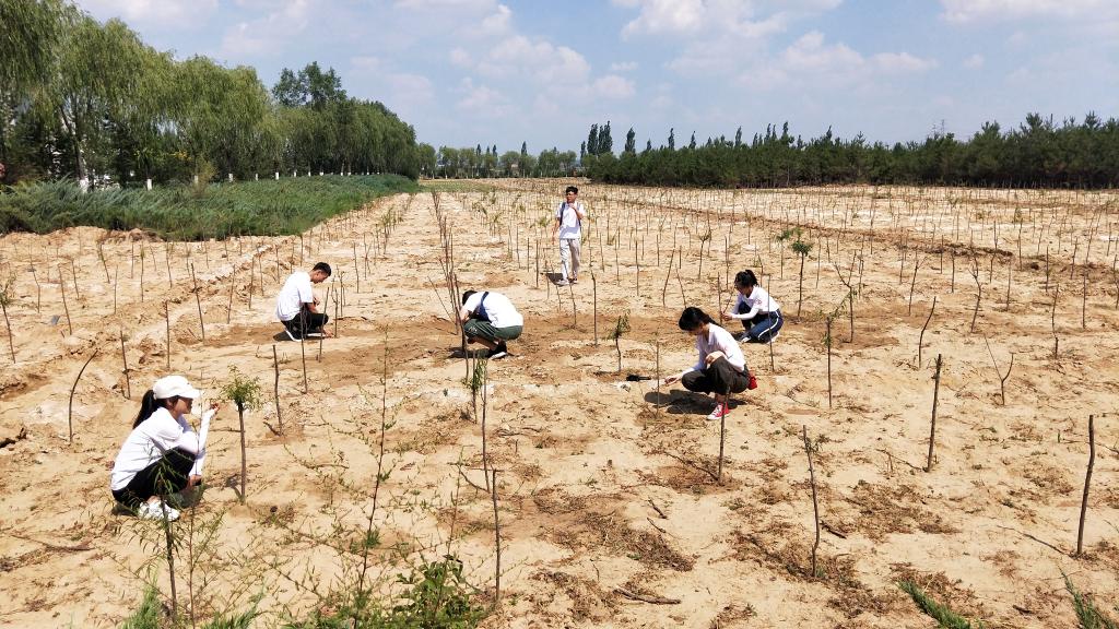 之后,王书记带着实践队队员们来到了北沙抚育区进行实地考察。数十年的艰苦奋斗,从荒漠到绿地,我们感叹小纪汗林场人员坚韧不拔的意志和不建绿洲不罢休的决心。他们将土壤运送覆盖到沙子上,种下固沙植被,用汗水浇灌绿洲的希望。通过王书记的讲述,我们了解到林业工人的艰辛。“足蒸暑土气,背灼炎天光。力尽不知热,但惜夏日长。”以前他们治沙时,带上鸡蛋、干粮和水一干就是一天,路途遥远,中午也不回去,就在沙地里休息。到现在才建造了这片林场,且近年来生态优化,沙土涵养了水源,只挖7~10米就可以见到水。但是,目前的治沙工作还存在一些问题,因为现在种植的多为樟子松,而樟子松油性大,容易发生火灾,所以需要研究各方面都适应沙漠的植被。